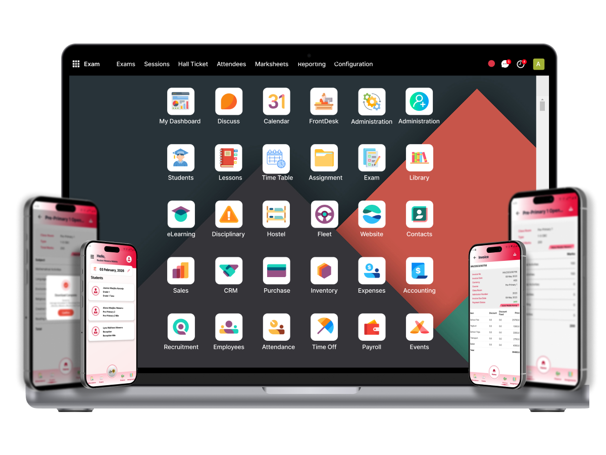 Manages academics, attendance, fees, administration, and communication - forming the foundation of the ecosystem.